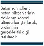 r. Ayrıca beton gibi yapının temel unsuru olan ve yapının sağlamlığıyla doğrudan ilgili bir üründe çeşitli yönetmeliklerle belirlenmiş kalite ve standardın tutturulması yasal bir zorunluluktur. Bütün bunlar sektörde kalite sistemlerinin oluşrurulmasını gündeme getirmiş, kalite denetiminde bulunmak ve sertifika kurallarını tanımlamak üzere sektörel sertifika kurumları kurulmuştur. İngiltere’de Betonarma Çelikleri Sertifika Kurumu (ARES), Hazır Beton Kalite Sistemi (ORMC) bunlardan bazılarıdır. Ülkemizde de hazır beton kalite denetimine yönelik olarak 1995 yılında Türkiye Hazır Beton Birliği Kalite Güvence Sistemi kurulmuştur. Bir hazır beton tesisinde kapasiteyi belirleyen temel üretim unsuru beton santralidir. Beton santraliyle birlikte transmikser ve pompa sayısı kapasite üzerinde kısıt oluşturan diğer üretim unsurlarıdır. Hazır beton, üretimini takiben en çok iki saat içinde kullanılması zorunlu olan bir inşaat malzemesidir. Dolayısıyla inşaat alanı ile beton santrali arasındaki mesafe ve santralden inşaat alanına betonun taşınma kapasitesi, beton santralinin kapasite kullanımını doğrudan etkiliyor. Bu nedenle taze betonun kullanılacağı yere betonun özellikleri bozulmadan taşınabilmesi gerekiyor. Beton taşıması için özel olarak tasarlanmış kamyon benzeri taşıt aracı olan transmikser, bir hazır beton tesisinin en önemli üretim araçlarından birisidir. Eğer santral kapasitesine uyumlu bir taşıma kapasitesi yoksa, santralde üretilen betonun inşaat alanına gerekli sürede taşınması mümkün olmayacağından, santralde beton üretimi taşıma kapasitesiyle sınırlanacaktır. Kapasiteyi etkileyen bir diğer üretim aracı pompa olup, betonun uygulama alanına (kalıba) hızlı bir biçimde aktarılmasını sağlamaktadır. Dolayısıyla pompalı dökümlerde transmikserlerin şantiyelerde bekleme süresi kısalmakta ve daha çok beton taşıma imkanı doğmaktadır. Hazır beton tesisleri ağırlıklı olarak Türkiye’nin batı illerinde kurulmuştur. Nüfus yoğunluğunun fazla olduğu, dış göç alan illerde ihtiyaç duyulan yeni konut ve bu illerde hızlı kentleşmeye bağlı olarak ortaya çıkan altyapı yatırım ihtiyacı, inşaat sektörüne olan talebi artırıyor. Dolayısıyla inşaat sektöründe faaliyet gösteren, inşaat malzemeleri üreten firmalarda bu illerde yoğunlaşıyor.