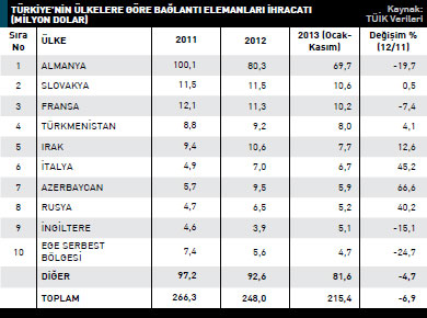 Türkiye’nin bağlantı elemanları ihracatı 2012 yılında, bir önceki yıla oranla yüzde 6,9 oranında azalarak 248 milyon dolar olarak kayda geçti. 2011 yılında bu rakam 266,3 milyon dolardı. Türkiye 2012 yılında en fazla altı köşeli başlı cıvata; demir/çelikten, çekme direnci mm 2.de 800 n./daha fazla kaleminde ihracat gerçekleştirdi. 2011 yılında 38,2 milyon dolar değerinde ihracat gerçekleştirilen söz konusu kalemin 2012 yılı ihracatı, yüzde 2,7 artarak 39,2 milyon dolara yükseldi. Listenin ikinci sırasında yer alan demir/çelikten diğer başlı cıvatalar kaleminde 2012 yılı ihracatı 44,9 milyon dolar olarak kaydedildi. Yüzde 19,4 azalan söz konusu mal grubunun 2011 yılı ihracatı 55,7 milyon dolardı. Üçüncü sıradaki demir/ çelikten vida benzeri diğer eşya; diş açılmamış kaleminde 2011 yılında 27,9 milyon dolarlık ihracat gerçekleştirilirken 2012 yılında bu rakam yüzde 4,1 azalarak 26,8 milyon dolar seviyesine geriledi. 2012 yılında bağlantı elemanları sektörü alt gruplar bazında en fazla ihracat artışının yaşandığı kalem yüzde 28,4 ile demir/çelikten pimler, kamalar; diş açılmamış oldu. 2011 yılında söz konusu ürün grubunda 8,1 milyon dolarlık ihracat gerçekleştirilirken bu rakam, 2012 yılında 10,4 milyon dolar seviyesine yükseldi. Türkiye 2012 yılında bağlantı elemanları sektöründe en fazla Almanya’ya ihracat gerçekleştirdi. 2011 yılında 100,1 milyon dolarlık ihracat gerçekleştirilen söz konusu  ülkeye, 2012 yılında gönderilen ürünlerin değeri 80,3 milyon dolar oldu. Türkiye’nin Almanya’ya yönelik bağlantı elemanları ihracatı yüzde 19,7 azaldı. Listenin ikinci sırasında yüzde 0,5 ihracat artışıyla Slovakya bulunuyor. 2012 yılında Slovakya’ya yönelik bağlantı elemanları ihracatı 11,5 milyon dolar olarak kayda geçti. Listenin üçüncü sırasındaki Fransa’ya 2012 yılında ihraç edilen bağlantı elemanlarının değeri 11,3 milyon dolar oldu. 2011 yılında Fransa’ya gönderilen ürünlerin değeri 12,1 milyon dolar seviyesindeydi. Fransa’ya yönelik bağlantı elemanları ihracatı yüzde 7,4 azaldı. Türkiye’nin 2012 yılında bağlantı elemanları ihracatını en fazla a