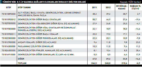 rtırdığı ülke yüzde 66,6 ile Azerbaycan oldu. 2011 yılında söz konusu ülkeye 5,7 milyon dolarlık ihracat gerçekleştirilirken bu rakam, 2012 yılında 9,5 milyon değerine yükseldi. Türkiye’nin bağlantı elemanları ithalatı 2012 yılında, bir önceki yıla göre yüzde 11,6 azalarak 526,7 milyon dolar olarak kaydedildi. 2011 yılında bu rakam 595,6 milyon dolardı. Türkiye 2012 yılında en fazla demir/çelikten diğer başlı cıvatalar mal grubunda ithalat gerçekleştirdi. 2011 yılında söz konusu kalemdeki ithalatın değeri 50,9 milyon dolarken bu rakam 2012 yılında, yüzde 4,2 azalarak 48,8 milyon dolar olarak kaydedildi. Listesinin ikinci sırasında ise ahşap vidaları; diğer (diş açılmış)kalemi yer alıyor. 2012 yılında söz konusu ürün grubunda gerçekleştirilen ithalatın değeri 32,7 milyon dolar oldu. 2011 yılında bu rakam 31,9 milyon dolar seviyesindeydi. 2012 yılında ahşap vidaları; diğer (diş açılmış)kalemi ürün grubunda yaşanan ithalat artışı yüzde 2,6 olarak kayda geçti. Üçüncü  sıradaki demir/ çelikten emniyet somunları kaleminde 2011 yılında 43 milyon dolarlık ithalat gerçekleştirilirken bu rakam 2012 yılında, yüzde 15,4 azalarak 36,4 milyon dolar seviyesine geriledi. Alt gruplar bazında ithalat oranının en fazla arttığı kalem yüzde 2,6 ile ahşap vidaları; diğer (diş açılmış) ürün grubu oldu. Türkiye 2012 yılında bağlantı elemanları sektöründe en fazla Çin’den ithalat gerçekleştirdi. Söz konusu ülkeden 2011 yılında 221,7 milyon dolar değerinde ürün ithal edilirken bu rakam, 2012 yılında yüzde 25 azalarak 166,2 milyon dolar olarak kaydedildi. En fazla ithalat gerçekleştirilen ikinci ülke ise Almanya oldu. Almanya’dan 2012 yılında bir önceki yıla oranla yüzde 5,3 düşüşle 88,1 milyon dolarlık bağlantı elemanları ithal edildi. 2011 yılında bu rakam 93,1 milyon dolardı. Listenin üçüncü sırasındaki Fransa’dan 2011yılında 68,2 milyon dolarlık ithalat gerçekleştirilirken bu rakam, 2012 yılında yüzde 12,7 azalarak 59,5 milyon dolar değerine geriledi. Türkiye’nin 2012 yılında bağlantı elemanları ithalatı en fazla artırdığı ülke ise yüzde 16,9 ile Tayvan oldu. Tayvan’dan 2011 yılında 23,4 milyon dolarlık bağlantı elemanı ithal edilirken bu rakam 2012 yılında 27,4 milyon dolara yükseldi.