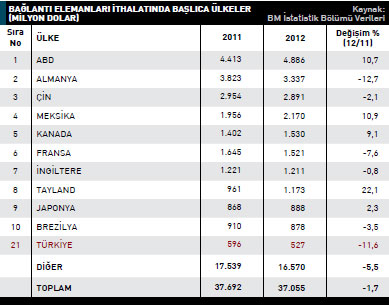 bağlantı elemanları ithalatı 2012 yılında 37 milyar dolar olarak kaydedildi. ABD, bağlantı elemanları ithalatında 2012 yılında 4,8 milyar dolar rakamıyla ilk sırada yer alıyor. 2011 yılında ABD’nin bağlantı elemanları ithalatı 4,4 milyar dolar seviyesindeydi. ABD’nin bağlantı elemanları ithalatında 2012 yılında yaşanan artış yüzde 10,7 oldu. En fazla bağlantı elemanı ithal eden ülkeler listesinin ikinci sırasında ise Almanya yer alıyor. 2011 yılında Almanya 3,8 milyar dolarlık ithalat gerçekleştirirken bu rakam 2012 yılında yüzde 12,7 azalarak 3,3 milyar dolar seviyesine geriledi. Listenin üçüncü sırasındaki Çin, 2012 yılında 2,8 milyar dolar değerinde bağlantı elemanı ithal etti. Bir önceki yıla göre ithalatı yüzde 2,1 azalan Çin’in, 2011 yılı bağlantı elemanları ithalatı 2,9 milyar dolardı. En fazla bağlantı elemanı ithal eden ilk 10 ülke listesinde, 2012 yılında, bir önceki yıla göre ithalatını en fazla artıran ülke yüzde 22,1 ile Tayland oldu. Tayland 2011 yılında 961 milyon dolar değerinde bağlantı elemanı ithal ederken, 2012 yılında bu rakam 1,1 milyar dolar değerinde kaydedildi. Türkiye 2012 yılında, 527 milyon dolarlık ithalat rakamıyla en fazla bağlantı elemanı ithal eden ülkeler listesinin 21. sırasında yer aldı. 2012 yılında Türkiye’nin bağlantı elemanları ithalatı 596 milyon dolardı. Türkiye’nin ithalatı yüzde 11,6 azaldı.