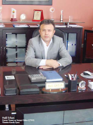 Bölgenin ekonomik ve sosyal açıdan gelişmesine, kurulduğu 1910 yılından bu yana katkıda bulunan Çorum Ticaret ve Sanayi Odası; kurumsal altyapısını tamamlamış ve uluslararası kalite standartlarında hizmet veren, kaynaklarını verimlilik esasıyla yöneten, gelişime ve yeniliğe açık örnek bir kurum olmayı hedefliyor. 2013 yılında yapılan seçimlerde yeni oluşturulan ÇTSO Yönetim Kurulunda yer alan Halil Erkan, kanunla kendilerine tanınan görev ve sorumluklar içinde çalışarak, bölgenin ulusal ve uluslararası alanda rekabet gücünü artırarak gelişimine katkıda bulunmak istediklerini söyledi. Çorum’un lokomotif sektörlerinin başında makine ve aksamlarının geldiğini belirten Halil Erkan, ÇTSO’nun sektöre yönelik hedefleri ve gelecek vizyonuyla ilgili bilgi verdi.