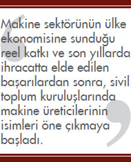 Sektörün ülke ekonomisine sunduğu reel katkı ve son yıllarda ihracatta elde edilen başarılar, ister istemez sivil toplum kuruluşlarında makine üreticilerinin isimlerini öne çıkarmaya başladı. Özellikle makine üretiminin geliştiği il ve bölgelerde yer alan firma temsilcilerimiz, meslek odaları ve sivil toplum yapılanmalarında önemli roller üstlenmeye başladı. Makine sektörünün Türkiye ekonomisi için artan önemi, sektörün katma değerli ürünlere yönelerek ülke ihracatındaki değerini yükseltmeye başlaması, ilerleyen süreçte de makine üreticilerinin adından daha fazla söz ettirecek. Sektörün yükselen prestiji, sivil toplumda temsilinin önünü daha da açacak, makine üreticileri karar mekanizmalarında daha çok yer alacaktır.