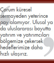 iyor. Çorum firmalarının gerek KOSGEB ve Kalkınma Ajansı gerekse Avrupa Birliği hibe programlarından yüksek oranda yararlanıyor olması göz önüne alındığında, büyük ölçekli yatırımların çekilememesi Çorum’un küresel sermayeden yeterince pay alamadığını gösteriyor. Kendi öz firmaları ile önemli sıçramalar yapan Çorum, ulusal ya da uluslararası boyutta yatırım ve yatırımcılar sayesinde ivmesini daha da yükseltecektir.