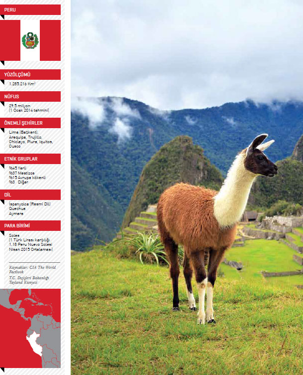 Güney Amerika’nın batısında ve Güney Pasifik Okyanusu kıyısında yer alan Peru, iklim, madencilik ve enerji kaynakları açısından son derece zengin bir ülkedir. Peru yüzölçümü bakımından Güney Amerika’nın en büyük üçüncü, doğal ormanlar açısından ise ikinci ülkesidir. Ülke topraklarının yüzde 2,8’i ekilebilir topraklardan oluşur. Peru coğrafi açıdan kıyı bölgeleri, dağlık bölgeler (And Dağları) ve yağmur ormanları olmak üzere üç ayrı bölgeden oluşur. Kıyı bölgeleri ülke topraklarının yüzde 11’ini, nüfusun ise yüzde 52’sini barındırır. Ülkenin önemli şehirlerinden olan Lima, Trujillo, Piura, Chiclayo, Ica ve Tacna bu bölgede yer alır. Dağlık bölgeler ise ülke nüfusunun yüzde 37’sinin yaşadığı ve İnkalar’ın başkenti olan Cusco’nun yer aldığı bölgedir. Bu bölge hem yerli, hem de yabancı turistlerin ziyaret ettiği başlıca bölgeler arasındadır ve önemli şehirleri Puno, Arequipa, Huancayo, Ayacucho, Huaraz ve Cajamarca olarak sıralanır. Yağmur Ormanlarının yer aldığı üçüncü bölge ise çok çeşitli bitki ve ağaç türlerine, nehirlere ve aynı zamanda da petrol ve doğal gaz yataklarına sahiptir. Ülke topraklarının yüzde 56’sını oluşturan bu bölgede nüfusun yüzde 11’i yaşar. Başlıca şehirler ise Iquitos ve Pucallpa’dır. Amazon Nehri, ülkeyi Brezilya’ya ve Atlantik Okyanusu’na; And Dağları ise İnkalar’ın yerleşim rotası üzerindeki Ekvator, Kolombiya, Bolivya, Venezüella, Şili ve Arjantin’e bağlar. Peru, Pasifik Okyanusu sayesinde de üyesi olduğu ve dünyanın en önemli, zengin ve en hızlı gelişen bölgelerinden olan APEC (Asya Pasifik Ekonomik İşbirliği) ülkeleri ile yakın ilişki kurma imkanına sahiptir. Birçok And medeniyetine ev sahipliği yapan Peru, İnkalar’ın 1533 yılında İspanyollarca işgal edilmesinin ardından ancak 1821 yılında bağımsızlığını ilan etti. Yıllarca süren askeri yönetim sonrasında ülkede 1980 yılında demokrasiye geçildi. Peru’da başkan hem devlet, hem de hükümetin başıdır. 29 Aralık 1993’ten bu yana yürürlükte olan Peru Anayasası’na göre beş yılda bir yapılan başkanlık seçimleri ile seçilen devlet başkanı, bakanlar kurulu üyelerini atama yetkisine sahiptir. Peru; Amazonas, Ancash, Apurimac, Arequipa, Ayacucho, Cajamarca, Callao, Cusco, Huancavelica, Huanuco, Ica, Junin, La Libertad, Lambayeque, Lima, Lima*, Loreto, Madre de Dios, Moquegua, Pasco, Piura, Puno, San Martin, Tacna, Tumbes, Ucayali olmak üzere 25 bölgeden ve 1 eyaletten oluşur. Yaklaşık 31 milyon nüfusa sahip olan ülkede nüfus artış hızı yüzde 1,0, yaş ortalaması ise 73,4’tür. Nüfusun yüzde 28,8’i 0–14 yaş arasında, yüzde 64,8’i 15–64 yaş arasında, yüzde 6,4’ü ise 65 yaşın üstündedir.