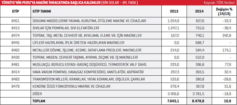 Türkiye, 2014 yılında Peru’nun 300 bin dolar ile makine ihraç ettiği ülkeler listesinin 42. Sırasında yer alıyor. Peru 2014 yılında 84. fasıl itibariyle en fazla dozerler, greyder, skreyper, ekskavatör, küreyici, yükleyici vb. kaleminde ihracat gerçekleştirdi. 2013 yılında söz konusu ürün grubunda 21,3 milyon dolarlık ürün ihraç edilirken 2014 yılında bu rakam, yüzde 82 artarak 38,8 milyon dolar seviyesinde kaydedildi. Listenin ikinci sırasında ise toprak, maden, cevheri tasıma, ayırma, seçme vb. iş makineleri bulunuyor. Söz konusu kalemde 2014 yılında gerçekleştirilen ihracatın değeri 35,3 milyon dolar olarak kaydedildi. 2013 yılında bu rakam 24,7 milyon dolar seviyesindeydi. Toprak, maden ,cevheri taşıma, ayırma, seçme vb. iş makineleri ürün grubunda gerçekleşen ihracat artışı yüzde 43,1 oldu. Listenin üçüncü sırasında bulunan toprak, taş, metal cevheri vb. ayıklama, eleme vb. için makineler kaleminde 2013 yılında 25,4 milyon dolar değerinde ihracat gerçekleştirilirken bu rakam 2014 yılında yüzde 16,6 artarak 29,6 milyon dolar seviyesinde kaydedildi. Peru’nun 2014 yılında bir önceki yıla oranla ihracatını en fazla artırdığı ürün grubu yüzde 232 ile turbojetler, turbo-propeller, diğer gaz türbinleri oldu.
