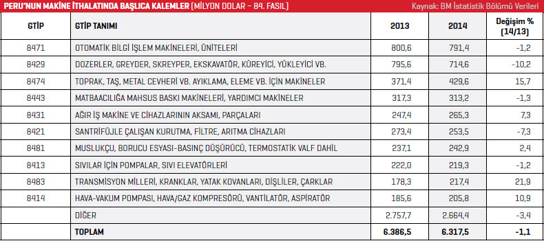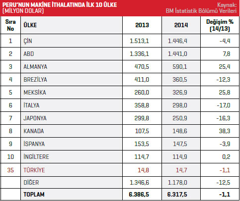 BM İstatistik Bölümü verilerine göre Peru’nun makine ithalatı 2014 yılında bir önceki yıla oranla yüzde 1,1 azalarak 6,317 milyar dolar olarak kaydedildi. 2013 yılında bu rakam 6,386 milyar dolar seviyesindeydi. 2014 yılı rakamlarına göre Peru’nun en fazla makine ithal ettiği ilk 10 ülke listesinin ilk sırasında Çin bulunuyor. Çin’den 2013 yılında 1,5 milyar dolar değerinde makine ithal eden Peru’nun, 2014 yılı makine ithalatı yüzde 4,4 azalarak 1,4 milyar dolar olarak kaydedildi. Peru, 2014 yılında listenin ikinci sırasında bulunan ABD’den 1,4 milyar dolar değerinde makine ithal etti. 2013 yılında bu rakam 1,3 milyar dolar seviyesindeydi. 2014 yılında Peru’nun ABD’den gerçekleştirdiği makine ithalatı yüzde 7,8 arttı. Peru’nun 2014 yılında en fazla makine ithal ettiği ilk 10 ülke listesinin üçüncü sırasında ise Almanya yer alıyor.