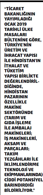Bu çerçevede, BM İstatistik Bölümü verilerine göre Hindistan’ın makine ihracatı, 2018’de yüzde 22,1 artışla 23,2 milyar dolar olarak kayda geçerken, ülke yüzde 33,8’lik artış ve 4,36 milyar dolarla en fazla ABD’ye makine ihraç etti. Hindistan’ın 2018’de en fazla makine ihraç ettiği ikinci ülke yüzde 33’lük artış ve 1,69 milyar dolarla Almanya oldu. Üçüncü sırada bulunan İngiltere’ye 2018’de yüzde 16 oranında artışla 1,11 milyar dolarlık makine ihraç edilirken, dördüncü sıradaki Çin’e ihraç edilen makinelerin değeri yüzde 23,4’lük artışla 897 milyon dolar oldu. 2018’de Türkiye, Hindistan’dan gerçekleşen makine ihracatında 13’üncü sırada yer aldı ve toplamda 524 milyon dolar değerinde makine ithal etti. Bu dönemde Türkiye’nin Hindistan’dan gerçekleştirdiği makine ithalatı ise yüzde 8,3 azaldı.