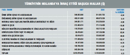 2008 yılında Türkiye’nin Hollanda’dan yaptığı toplam ithalat içinde ise en büyük paya sahip olan ürün grubu yaklaşık yüzde 20 ile “demir ve çelik”. Bu ürün grubunu, yüzde 14,1 pay ile “plastik ve plastikten mamul eşya” izliyor. 84’üncü fasılda bulunan “makine ve ak samları” ise Hollanda’dan ithalatta 3’üncü sırada bulunuyor.