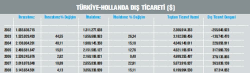 Türkiye ile Hollanda arasında 2002 yılında 2.366 milyon dolar olan toplam dış ticaret hacmi 2,6 katından fazlasına çıkarak 2008 yılında 6.199 milyon doları aştı. Bu durum Türk işadamlarının pazardaki yerlerini sağlamlaştırma çabalarının ürünü olarak görülüyor 2008 yılında 3.143 milyon dolarlık ihracata karşılık, söz konusu ülkeden 3.056 milyon dolara yakın ithalat yapılmış. Hollanda ile Türkiye’nin dış ticaret hacmi Türkiye lehine fazla veriyor. Dış ticaret fazlası 2008 yılında 87,3 milyon dolar civarına ulaştı. Diğer taraftan, 2008 yılında Hollanda’ya olan ihracat yüzde 4,1 artarken, Hollanda’dan ithalat yüzde 15,1 oranında artış sergiledi. Rakamlara bakıldığında Hollanda pazarında Türk işadamları nın kendilerinden söz ettirmeye başladığı sonucuna ulaşmak mümkün. İki ülke arasında dış ticaretin daha yakından incelenmesi amacıyla mal grupları bazında verilere bakıldığında; 2008 yılında Türkiye’nin Hollanda’ya yaptığı toplam ihracat içinde en büyük paya sahip olan ürün grubunun 511 milyon dolar ile “örme giyim eşyası ve aksesuarları” olduğu görülüyor. Bu ürün grubunu, “örülmemiş giyim eşyası ve aksesuarları” ile “motorlu kara taşıtları” izliyor. 2008 yılında Hollanda’ya ihracatta 84’üncü fasılda bulunan “makine ve aksamları” 5’inci sırada yer alıyor. Söz konusu ülke, makine ve aksamları açısından ihracatın gelişme kaydettiği potansiyel bir pazar niteliği taşıyor.