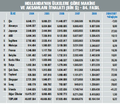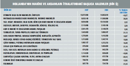 Makine sektör toplamı, 84. faslın tamamı ve 84. fasıl dışı Orta Anadolu ve Aksamları İhracatçıları Birliği iştigal alanı itibariyle Türkiye’nin Hollanda’dan ithalatı, 2008 yılında bir önceki yıla göre yüzde 15,6’lık artışla 348,6 milyon dolar olarak gerçekleşti. Hollanda’dan en fazla ithal edilen mal grubunu, 48,2 milyon dolar ile “gıda sanayiinde kullanılan makineler” oluşturdu. 2008 yılında Türkiye’nin Hollanda’dan 84’üncü fasıl itibariyle en fazla ithal ettiği ürün grubu ise, yüzde 9,8 pay ile 8438 nolu GTİP’de yer alan “yiyecek/içecek sanayinde kullanılan makine ve cihazlar” oldu. “Buhar kazanları dışında kalan merkezi ısıtma kazanları” ile “kendine özgü fonksiyonlu makine ve cihazlar” diğer önemli ithal kalemleri arasındaki yerini aldı. 2008 yılında Hollanda’nın başlıca beş ihraç fası lı sırasıyla; mineral yakıtlar ve yağlar, makine ve aksamları, elektrikli makineler, organik kimyasallar ve plastik ile plastikten mamul eşyalar oldu. 2008 yılında Hollanda’nın başlıca beş ithal fasılı ise sırasıyla; mineral yakıtlar, makine ve aksamları, elektrikli makineler, motorlu kara taşıtları ve eczacılık ürünleri olarak kaydedildi. Makine ve aksamları ürün grubu Hollanda’nın dış ticaretinde önemli yer tutmakta olup, ülkenin toplam ihracatından aldığı pay yüzde 15,6 iken, ithalatından aldığı pay ise yüzde12,9 oldu.