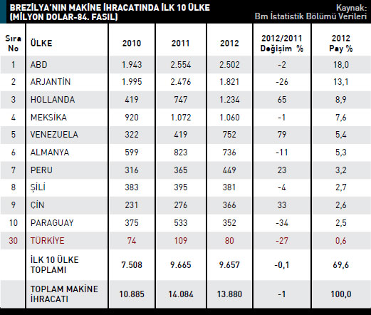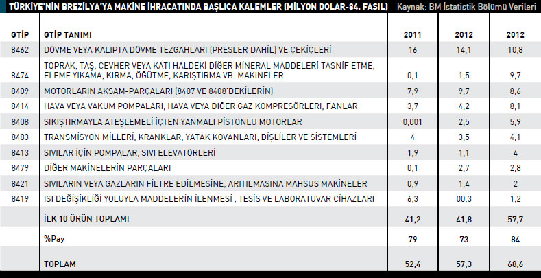 Türkiye Brezilya’nın makine sektöründe en fazla ihracat gerçekleştirdiği ülkeler listesinde 30. sırada yer aldı. Brezilya’nın 84. fasılda en fazla ihracat gerçekleştirdiği ilk üç ürün grubu: Dozerler, greyderler, skreyper, ekskavatör, küreyici, yükleyici vb.; motorların aksam-parçaları (8407 ve 8408’dekilerin); hava veya vakum pompaları, hava veya diğer gaz kompresörleri, fanlar, davlumbazlar olarak sıralandı. Listenin dördüncü sırasında bulunan kıvılcım ateşlemeli içten yanmalı motorlar kaleminden 2012 yılında 864 milyon dolarlık ihracat gerçekleştirilirken beşinci sıradaki; kendine özgü bir fonksiyonu olan diğer makineler ve mekanik cihazlar, diğer makinelerin aksam ve parçaları (elektrik konektörleri, izalatörler, bobinler, kontaklar vb.) kalemindeki ihracatın tutarı 354 milyon dolar oldu. Brezilya’nın 2012 yılında, bir önceki yıla göre yüzde 117,9 artışla en fazla ihraç ettiği ürün grubu; kendine özgü bir fonksiyonu olan diğer makineler ve mekanik cihazlar diğer makinelerin aksam ve parçaları (elektrik konnektörleri, izolatörler, bobinler, kontaklar vb.)oldu. 2011 yılında 354 milyon dolar değerinde ihracat gerçekleştirilen söz konusu kalemin, 2012 yılı ihracatı 771,4 milyon dolar olarak kaydedildi.