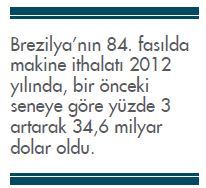 yer alıyor. 1990’lı yıllardaki liberalizasyon çabalarının sonucunda, özelleştirme ve doğrudan yabancı yatırımlarla hızla gelişen Brezilya’ya yönelik Türkiye’nin makine ihracatı, 2012 yılında bir önceki yıla oranla yüzde 21,1 arttı.