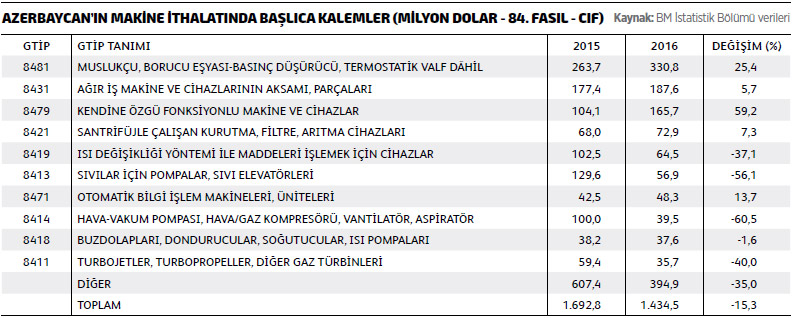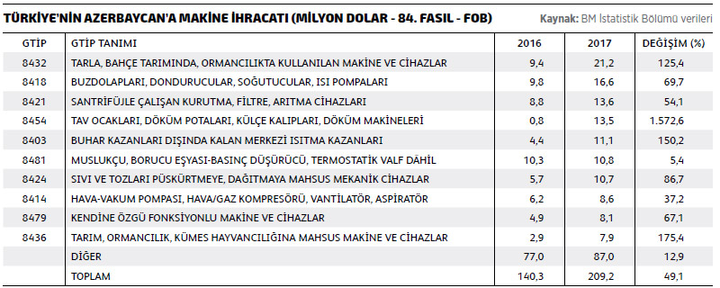 Türkiye, 2016 yılında 151,8 milyon dolarla Azerbaycan’ın en fazla makine ithal ettiği ülkeler listesinin dördüncü sırasında yer aldı. 2015 yılında Azerbaycan’ın Türkiye’den ithal ettiği makinelerin değeri 171,4 milyon dolardı. Türkiye’nin Azerbaycan’a yönelik makine ihracatı 2016 yılında bir önce yıla oranla yüzde 11,4 azaldı. Azerbaycan, 2016 yılında en fazla muslukçu, borucu eşyası-basınç düşürücü, termostatik valf dâhil kaleminde ürün ithal etti. 2015 yılında söz konusu ürün grubunda 263,7 milyon dolarlık ithalat gerçekleştirilirken, 2016 yılında bu rakam yüzde 25,4 artarak 330,8 milyon dolar olarak kayda geçti. Listenin ikinci sırasında ağır iş makine ve cihazlarının aksamı, parçaları bulunuyor. Azerbaycan, 2015 yılında söz konusu kalemde 177,4 milyon dolar değerinde makine ithal ederken, 2016 yılında bu rakam yüzde 5,7 artışla 187,6 milyon dolar oldu. Azerbaycan’ın en fazla ithalat gerçekleştirdiği üçüncü kalem kendine özgü fonksiyonlu makine ve cihazlar oldu. 2015 yılında söz konusu ürün grubunda 104,1 milyon dolarlık ithalat gerçekleştirilirken, 2016 yılında bu rakam yüzde 59,2 artarak 165,7 milyon dolar oldu. Türkiye’nin 84. fasılda Azerbaycan’a gerçekleştirdiği makine ihracatı 2017 yılında 209,2 milyon dolar (FOB) olarak kaydedildi. Azerbaycan’a makine ihracatımız 2017 yılında yüzde 49,1 artarken, Türkiye’nin Azerbaycan’a makine ihracatının ilk sırasında tarla, bahçe tarımında, ormancılıkta kullanılan makine, cihazlar yer alıyor. Söz konusu kalemde Azerbaycan’a 2016 yılında 9,4 milyon dolar değerinde ürün ihraç edilirken 2017 yılında bu rakam yüzde 125,4 artışla 21,2 milyon dolar seviyesinde kaydedildi. Listenin ikinci sırasında bulunan buzdolapları, dondurucular, soğutucular ve ısı pompaları ürün grubunda 2016 yılında gerçekleştirilen ihracatın değeri 9,8 milyon dolar olarak kaydedilirken, 2017 yılında bu rakam yüzde 69,7 artarak 16,6 milyon dolar oldu. Türkiye’nin Azerbaycan’a yönelik makine ihracatında ilk 10 ürün grubu listesinin üçüncü sırasında ise santrifüjle çalışan kurutma, filtre, arıtma cihazları bulunuyor. 2016 yılında söz konusu kalemde 8,8 milyon dolarlık ihracat gerçekleştirilirken, 2017 yılında bu rakam yüzde 54,1 artarak 13,6 milyon dolar seviyesinde kaydedildi.