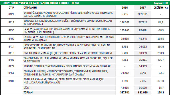 Guyana, 2016 yılında 84. fasıl itibarıyla en fazla ağır iş makine ve cihazlarının aksam ve parçaları kaleminde ihracat gerçekleştirdi. 2015 yılında söz konusu ürün grubunda 18 milyon dolarlık ürün ihraç edilirken 2016 yılında bu rakam, yüzde 271,5 artarak 67,5 milyon dolar seviyesinde kaydedildi. Listenin ikinci sırasında ise hava-vakum pompası, hava-gaz kompresörü, vantilatör, aspiratör kalemi bulunuyor. Söz konusu kalemde 2015 yılında gerçekleştirilen ihracatın değeri 580 bin dolarken, 2016 yılında bu rakam yüzde 228,3 artarak 1,9 milyon dolar seviyesinde kayda geçti. Listenin üçüncü sırasında bulunan sıvılar için pompalar, sıvı elevatörleri kaleminde ise 2015 yılında 153 bin dolar değerinde ihracat gerçekleştirilirken, 2016 yılında bu rakam yüzde 494,1 artışla 909 bin dolar oldu.