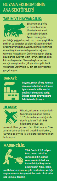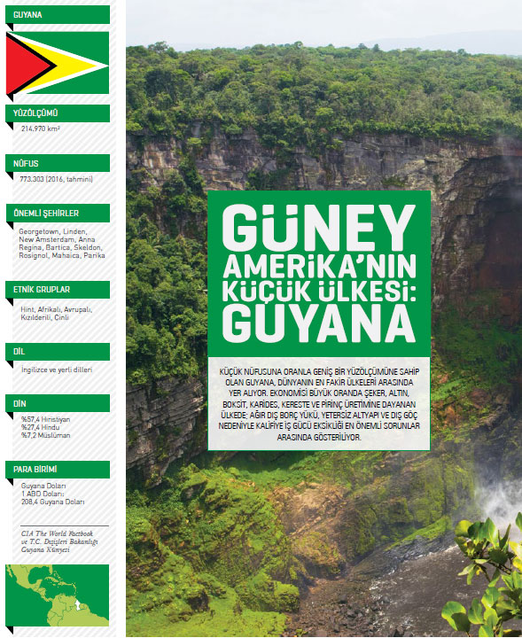 Denizaşırı seferlerde üs olarak kullanılabilmesi ve birçok yere uygun ulaşım şartlarına sahip olması sebebiyle tarih boyunca çeşitli istilalara maruz kalan; değişik zamanlarda İspanyol, Hollanda ve İngiliz işgali altına giren ülkenin devlet olarak tarihi, 1831’de Demerara, Essoquibo ve Berbice bölgelerinin birleşerek Guyana’yı oluşturmasıyla başlıyor. 1834’e kadar nüfusunu sadece İngiliz ve yerlilerin meydana getirdiği bir devlet olan Guyana’ya, bu tarihte 240 bin civarında tarım işçisi de getirilmiş. Bundan sonraki iki yüzyıl sosyoekonomik bakımdan zayıf bir İngiliz sömürgesi olarak var olan Guyana, Birinci ve İkinci Dünya Savaşları’ndan fiili olarak etkilenmese de gelişimi daha da yavaşlamış. 1953’te İngiltere’nin yardımıyla hızlı bir gelişme dönemine giren ülkede iki parti arasındaki rekabet ise İngilizlerin Guyana’ya tam bağımsızlık vermesini geciktiren en önemli etken olarak gösteriliyor. Guyana ancak 26 Mayıs 1966’da İngiliz Milletler Topluluğu (Commonwealth of Nations) üyesi bir devlet olarak bağımsızlığına kavuşurken, Guyana’yı meydana getiren üç devlet, iç işlerinde hükümete bağlı olarak, bugün de ülke yönetiminde ayrı eyaletler statüsünde varlığını sürdürüyor. Guyana, fiziki özellikleri bakımdan kıyı, orman ve savana olmak üzere üç bölgeye ayrılıyor. Kıyılar denizden itibaren 10-60 kilometre genişliğinde bir şerit ve denizden birkaç yüz metrelik irtifada olan alçak alanlarken, kıyı kısımları bu özelliği nedeniyle özel bant ve bariyerlerle korunuyor. Bu bölgeden iç kısımlara doğru gidildikçe ormanların başladığı ülkede bol yağış alan bu alanlar