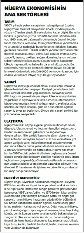 Ayrıca, sadece petrol ve doğal gaz değil yer altı madenciliğinde de zengin kaynaklara sahip olan ülkedeki yetersiz madencilik faaliyetleri ve düşük üretim nedeniyle, maden sektörünün ekonomiye katkısı da yüzde 1 seviyelerini aşamıyor. Oysa bu oran, Nijerya’nın Afrika’daki en büyük ekonomik rakibi Güney Afrika’da yüzde 18 civarında ilerliyor.