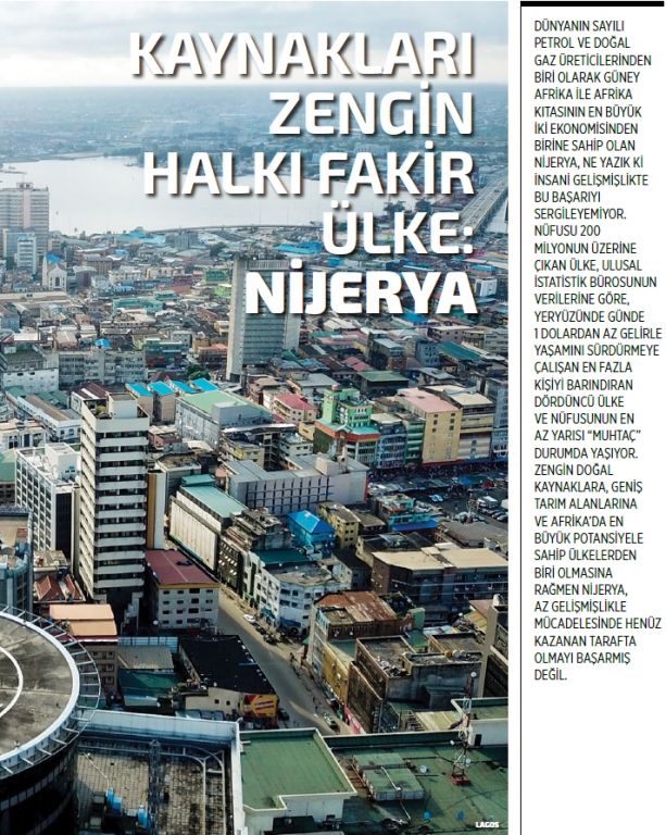 Nijerya, Güney Afrika ile Afrika’nın en büyük iki ekonomisinden biri. Ancak dünyanın sayılı petrol ve doğal gaz üreticisi ve ihracatçılarından olan Nijerya, insani gelişmişlikte bir hayli geri kalmış bir ülke. Nijerya Ulusal İstatistik Bürosuna göre, yeryüzünde günde 1 dolardan az gelirle yaşamını sürdürmeye çalışan en fazla kişiyi barındıran dördüncü ülke olan Nijerya’da nüfusun yarıdan fazlası “muhtaç” durumda yaşıyor. Oysa “Afrika’nın devi” olarak adlandırılan ve kıtanın en kalabalık ülkesi olan Nijerya, zengin doğal kaynakları ve geniş tarım alanlarıyla Afrika’da en büyük potansiyele sahip ülkelerden biri olarak gösteriliyor. Ham petrol üretiminde dünyanın ilk 15 ülkesi arasında bulunan Nijerya, petrol ihracatı bakımından da altıncı sırada yer alıyor. Nijerya günde 1,5 milyon varilden fazla ham petrol üretimi yaparken, en az 500 bin varillik kapasitesini ise altyapı yetersizlikleri ve ülkedeki güvenlik endişeleri nedeniyle kullanamıyor.