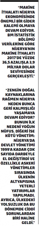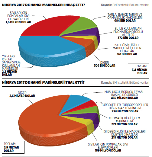 Bununla birlikte, makine ithalatı Nijerya ekonomisinde önemli bir gider kalemi olmaya devam ediyor. BM İstatistik Bölümü verilerine göre Nijerya’nın makine ithalatı 2017’de yüzde 36,5 azalışla 3,9 milyar dolar seviyesinde gerçekleşti. 2017 yılı verilerine göre Nijerya’nın en fazla makine ithal ettiği ilk 10 ülke listesinin ilk sırasında 1,4 milyar dolarla Çin yer alırken, listenin ikinci sırasında bulunan Almanya’dan 326 milyon dolar değerinde makine ithal edildi. Listesinin üçüncü sırasındaki ABD’den 2017’de ithal edilen makinelerin değeri ise 306 milyon dolar oldu. Nijerya 2017’de listenin dördüncü sırasındaki İngiltere’den 298 milyon dolarlık makine ithal ederken, beşinci sıradaki İtalya’dan da 252 milyon dolarlık ithalat gerçekleştirdi. Türkiye ise Nijerya’nın makine ithalatında, BM İstatistik Bölümü verilerine göre 51 milyon dolarla 11’inci sırada yer alırken, Türkiye’nin Nijerya’ya makine ihracatının bu dönemde yüzde 21,6 artış gösterdiği görülüyor.