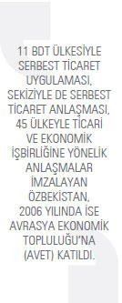 Bununla birlikte, 11 BDT ülkesi ile serbest ticaret uygulamasına, sekiz BDT ülkesi ile Serbest Ticaret Anlaşmasına, 45 ülkeyle ticari ve ekonomik işbirliğine yönelik anlaşmalar imzalayan Özbekistan, 2006 yılında ise Avrasya Ekonomik Topluluğu’na (AvET) katıldı. 2000 yılı sonunda kurulan ve genel itibarıyla AB benzeri bir ekonomik entegrasyonu içeren AvET, kişi, mal ve hizmetlerin serbest dolaşımı ve ortak bir pazar kurulmasını hedefliyor.