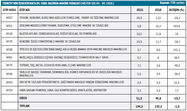 Özbekistan’ın makine ithalatındaki ilk 10 ürün grubu içerisinde en yüksek artış ise 8402 GTİP kodlu “Buhar jeneratörleri, kızgın su üreten kazanlar” ürün grubunda oldu. Bu ürün grubunda 2016’da yüzde 40,5’lik artışla 63,7 milyon dolarlık ithalat gerçekleştirildi.