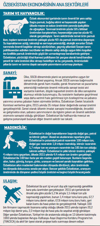 Ülkenin sanayi geçmişi ise yine SSCB dönemindeki planlı ve potansiyele uygun yatırımlar nedeniyle güçlü bir görünüm sergiliyor. Bununla birlikte, bağımsızlık sonrasında geBÜYÜME İVMESİ GÜÇLÜ 2015 yılı Gayri Safi Yurt İçi Hasılası (GSYİH) bir önceki yıla göre yüzde 8 büyüyen Özbekistan’da GSYİH içinde özel sektörün payı ise yüzde 82,9 olarak gerçekleşmişti. Son beş yılda ortalama yüzde 8,1 oranında büyüyen ülke, hızlı büyümesini ise güçlü iç ve dış talep ile gerçekleştiriyor. Özellikle yurt dışında çalışan Özbek işçi vatandaşlarının gönderdiği dövizler (GSYİH’nin yüzde 15’i) ve ülkenin ihraç mal fiyatlarının (altın ve hidrokarbon) dönemsel olarak yüksek seyretmesinin etkisiyle tüketim ve gayrimenkule yatırım canlılığını koruyor.
