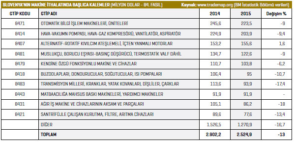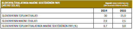 Bölümü verilerine göre, 2015 yılında yüzde 14,7 kayıpla 2,9 milyar dolar seviyesinde gerçekleşti. Bu dönemde, Almanya, Avusturya ve Hırvatistan Slovenya’nın en güçlü ticaret ortakları olurken, İtalya, Rusya, Fransa, Sırbistan, Romanya, ABD ve Polonya, Slovenya’nın makine ihracatında önemli ülkeler olmayı sürdürdü. Bu dönemde Türkiye de 28,1 milyon dolarlık alımla Slovenya’nın makine ihracatında 21’inci sırada yer aldı.
