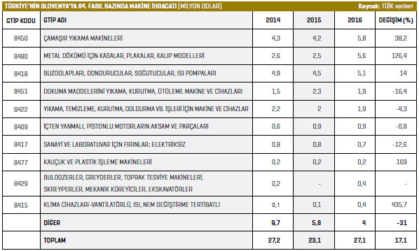Türkiye’nin 84’üncü fasılda Slovenya’ya gerçekleştirdiği makine ihracatı içinde ilk sırada 8450 GTİP kodlu “Çamaşır yıkama makineleri” ürün grubu yer alırken, söz konusu kalemde Slovenya’ya 2016’da yüzde 38’lik artışla 5,8 milyon dolar değerinde makine ihraç edildi. Bu rakam, 2015 yılında 4,2 milyon dolar olarak ölçülmüştü. Listenin ikinci sırasında bulunan 8480 GTİP kodlu “Metal dökümü için kasalar, plakalar, kalıp modelleri” ürün grubunda ise yüzde 126,4’lük artışla 5,6 milyon dolarlık ihracat gerçekleştirildi. Üçüncü sıradaki 8418 GTİP kodlu “Buzdolapları, dondurucular, soğutucular, ısı pompaları” ürün grubunda da yüzde 14 artışla 5,1 milyon dolarlık ihracat gerçekleştirildiğini söylemeliyiz.
