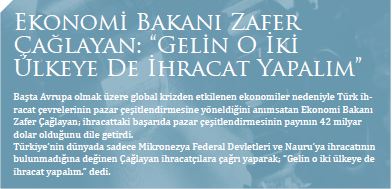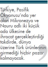 Pasifik Okyanusu’nda yer alan Mikronezya ve Nauru Federal Devletleri dünya üzerinde Türk ürünlerinin girmediği son iki pazar olarak öne çıkıyor. Oldukça küçük nüfusa ve yüzölçümüne sahip bu iki ayrı ada ülkesine de ihracat gerçekleştirilmesi için çalışmalara başlandı.Türk ihracatçılarının 2023 yılında 500 milyar dolar ihracat hedefiyle Türkiye’yi dünyanın ilk 10 ekonomisi arasına yükseltme yolundaki çalışmaları hız kesmeden devam ediyor. Bugün itibarıyla 241 gümrük bölgesine ihracat gerçekleştiren Türkiye’nin, halihazırda ürün satmadığı iki ülke bulunuyor. Türkiye, Pasifik Okyanusu’nda yer alan Mikronezya ve Nauru adlı iki küçük ada ülkesine de ihracat ger - çekleştirdiği takdirde, dünya üzerine Türk ürünlerinin girmediği hiçbir pazar kalmayacak.