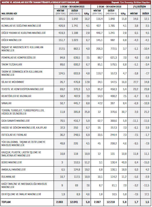 2016 yılının Ocak-Kasım döneminde en fazla ihracat gerçekleştiren alt sektör motorlar oldu. 2016 yılının Ocak- Kasım döneminde söz konusu ürün grubunda gerçekleştirilen ihracatın değeri 1,8 milyar dolar olarak kaydedildi. 2015 yılının aynı döneminde bu rakam 1,6 milyar dolar seviyesindeydi. Motorlar kalemindeki ihracat artışı yüzde 12,1 oldu. Listenin ikinci sırasında bulunan klimalar ve soğutma makineleri kaleminde 2015 yılının Ocak-Kasım döneminde 1,741 milyar dolarlık ihracat gerçekleştirilirken 2016 yılının aynı döneminde bu rakam yüzde 2,5 artışla 1,785 milyar dolar seviyesine yükseldi. En fazla ihracat gerçekleştiren üçüncü kalem ise diğer yıkama ve kurutma makineleri olarak kayda geçti. 2016 yılının Ocak-Kasım döneminde diğer yıkama ve kurutma makineleri ürün grubundaki ihracat ise 1,2 milyar dolar oldu. 2015 yılının aynı döneminde bu rakam 1,1 milyar dolar seviyesindeydi.