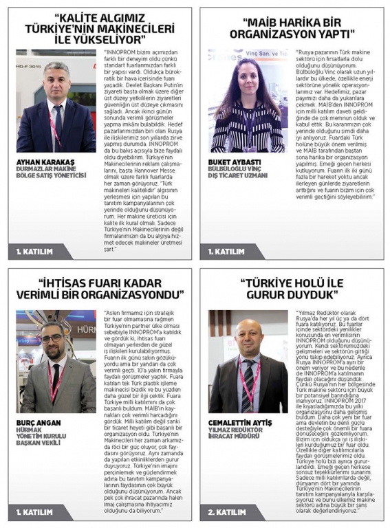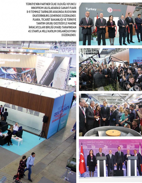 Rusya’nın en büyük sanayi fuarlarından INNOPROM’da bu yıl partner ülke olan Türkiye, Sanayi ve Teknoloji Bakanlığı ile Ticaret Bakanlığı ve Türkiye Tanıtım Grubu desteğiyle Ekaterinburg’ta güçlü tanıtım çalışmaları yaptı. Sanayi ve Teknoloji Bakanı Mustafa Varank ile Ticaret Bakan Yardımcısı Gonca Yılmaz Batur’un katılımıyla gerçekleşen fuarda Türkiye’nin Makinecileri de stant ile yer aldı. Makine İhracatçıları Birliği Yönetim Kurulu Başkanı Kutlu Karavelioğlu, “Yılın ilk altı ayında Rusya’ya gerçekleşen toplam makine ihracatımız 224 milyon dolar oldu. Geçtiğimiz yılın aynı dönemine göre yüzde 12’lik artış sağlamış olsak da 2013’te ulaştığımız 769 milyon dolarlık makine ihracatıyla karşılaştırıldığında, Rusya ile makine ticaretinde istediğimiz seviyede olmadığımızı görüyoruz. Rusya’da güvenilir bir komşu olmanın ötesine geçmek ve Rus sanayisinin teknolojide stratejik çözüm ortağı olmak istiyoruz” dedi.