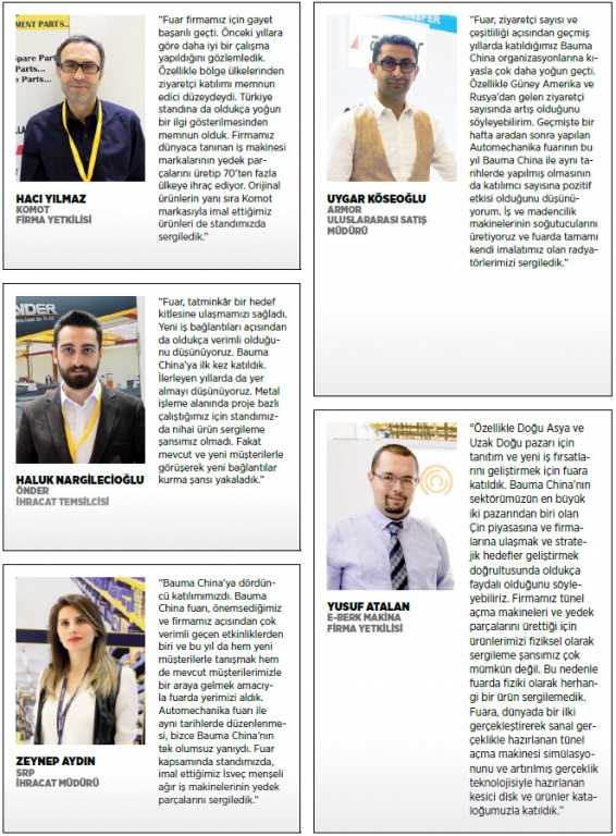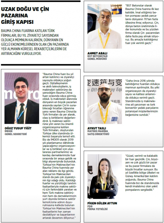TÜRKİYE’NİN MAKİNECİLERİ 27-30 KASIM TARİHLERİNDE ÇİN’İN ŞANHAY KENTİNDE DÜZENLENEN 9. İŞ, İNŞAAT VE MADENCİLİK MAKİNELERİ FUARI BAUMA CHINA’YA KATILARAK, ZİYARETÇİLERE TÜRK MAKİNE SEKTÖRÜNÜN ÜRETİM GÜCÜ HAKKINDA BİLGİ VERDİ.