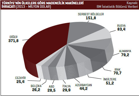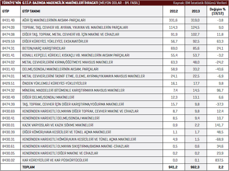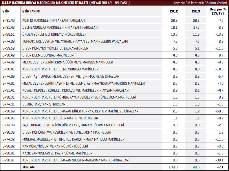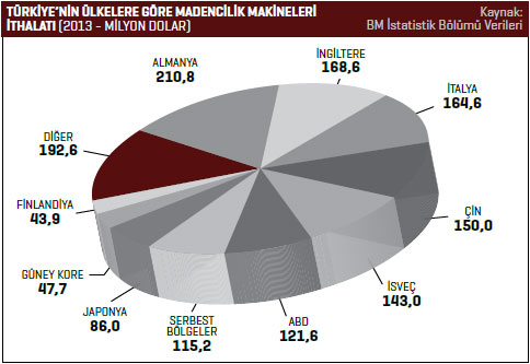 toprak, metal cevheri vb. için makine ve cihazlar kalemindeki ihracat 2012 yılında 91,9 milyon dolar seviyesindeyken, 2013 yılında bu rakam yüzde 11,8 artarak 102,7 milyon dolar rakamına yükseldi. BM İstatistik Bölümü verilerine göre Türkiye’nin madencilik makineleri ithalatı 2012 yılında 1 milyar 414 milyon dolarken bu rakam, 2013 yılında yüzde 2,1 artarak 1 milyar 444 milyon dolar seviyesinde yükseldi. Türkiye 2013 yılında 210,8 milyon dolarla en fazla Almanya’dan madencilik makineleri ithal etti. 2012 yılında söz konusu ülkeden gerçekleştirilen ithalatın değeri 235,4 milyon dolardı. Türkiye’nin 2013 yılında Almanya’dan gerçekleştirdiği ithalat yüzde 10,5 azaldı. Listenin ikinci sırasında bulunan İngiltere’den 2012 yılında 140,5 milyon dolarlık madencilik makineleri ithal edilirken bu rakam, 2013 yılında yüzde 20 artarak 168,6 milyon dolar olarak kaydedildi. Üçüncü sırada bulunan İtalya’dan 2013 yılında 164,6 milyon dolar değerinde madencilik makineleri ithal edildi. 2012 yılında Türkiye’nin söz konusu ülkeden gerçekleştirdiği madencilik makineleri ithalatı 237,1 milyon dolardı. İtalya’dan gerçekleştirilen ithalat yüzde 30,6 azaldı. Türkiye’nin 2013 yılında madencilik makineleri ithalatını en fazla artırdığı ülke yüzde 49,9 ile ABD oldu. ABD’den 2012 yılında 81,1 milyon dolar değerinde madencilik makineleri ithal edilirken 2013 yılında bu rakam 121,6 milyon dolar değerine yükseldi. Türkiye 2013 yılında en fazla önden yüklemeli küreyici-yükleyiciler kaleminde ithalat gerçekleştirdi. Söz konusu ürün grubunda 2012 yılında 273,6 milyon dolarlık ithalat gerçekleştirilirken, bu rakam 2013 yılında yüzde 6,2 azalarak 256,7 milyon dolar olarak kaydedildi. Listenin ikinci sırasında bulunan diğer küreyici, yükleyici, ekskavatörler kaleminde 2013 yılında 237,9 milyon dolar değerinde ithalat gerçekleştirildi. 2012 yılında bu rakam 240,9 milyon dolardı. 2013 yılında diğer küreyici, yükleyici, ekskavatörler ürün grubu ithalatı yüzde 1,2 azaldı.
