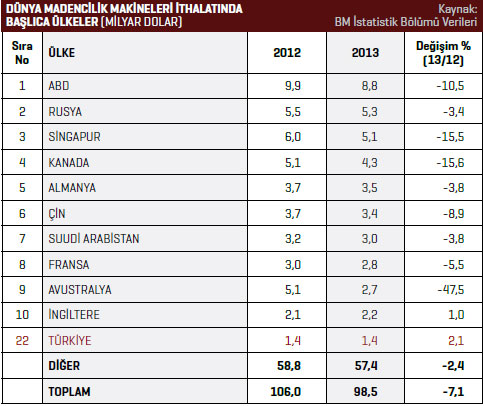 BM İstatistik Bölümü verilerine göre dünya ölçeğinde madencilik makineleri ithalatı ise 2013 yılında bir önceki yıla göre yüzde 7,1 azaldı. 2012 yılında 106 milyar dolarlık madencilik makineleri ithal edilirken, 2013 yılında bu rakam 98,5 milyar dolar seviyesine geriledi. ABD, 2013 yılında 8,8 milyar dolar rakamıyla en fazla madencilik makineleri ithal eden ilk 10 ülke listesinin ilk sırasında yer aldı. ABD’nin 2012 yılı madencilik makineleri ithalatı 9,9 milyar dolar olarak kaydedildi. Söz konusu ülkenin 2013 yılında ithalatı yüzde 10,5 artış azaldı. Listenin ikinci sırasında ise Rusya bulunuyor. 2012 yılında Rusya 5,5 milyar dolar değerinde madencilik makineleri ithal ederken, bu rakam 2013 yılında, yüzde 3,4 azalarak 5,3 milyar dolar olarak kaydedildi. Singapur, dünya geneli madencilik makineleri ithalatı listesinin üçüncü sırasında yer alıyor. 2013 yılında Singapur’un madencilik makineleri ithalatı yüzde 15,5 azalarak 5,1 milyar dolar oldu. 2012 yılında bu rakam 6 milyar dolar seviyesindeydi. Türkiye, 2013 yılında dünya geneli madencilik makineleri ithalatı listesinin 22. sırasında yer aldı. Türkiye’nin, 2013 yılında madencilik makineleri ithalatı bir önceki yıla göre yüzde 2,1 arttı. Türkiye 2013 yılında 1,4 milyar dolar değerinde madencilik makineleri ithalatı gerçekleştirdi. En fazla madencilik makineleri ithal eden ilk 10 ülke listesinde, 2012 yılına göre ithalatını en fazla artıran ülke ise yüzde 1 ile İngiltere oldu.