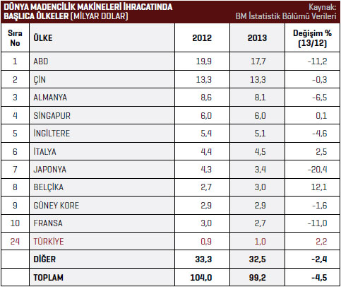Birleşmiş Milletler (BM) İstatistik Bölümü verilerine göre, 2012 yılında 104 milyar dolar olan dünya madencilik makineleri ihracatı, 2013 yılında yüzde 4,5 azalarak 99,2 milyar dolar seviyesine geriledi. İhracat listesinin ilk sırasında bulunan ABD, 2013 yılında 17,7 milyar dolar değerinde madencilik makineleri ihraç etti. 2012 yılında bu rakam 19,9 milyar dolar seviyesindeydi. ABD’nin madencilik makineleri ihracatı yüzde 11,2 azaldı. Listenin ikinci sırasındaki Çin 2013 yılında 13,3 milyar dolar değerinde madencilik makineleri ihraç etti. En fazla madencilik makineleri ihraç eden ilk 10 ülke listesinin üçüncü sırasındaki Almanya 2013 yılında 8,1 milyar dolar değerinde ihracat gerçekleştirdi. 2012 yılında Almanya’nın madencilik makineleri ihracatı 8,6 milyar dolardı. Almanya’nın madencilik makineleri ihracatı 2013 yılında yüzde 6,5 azaldı. Türkiye ise dünyada madencilik makineleri ihracatı listesinin 24. sırasında yer alıyor. En fazla madencilik makineleri ihraç eden ilk 10 ülke listesinde, 2012 yılına göre ihracatını en fazla artıran ülke ise yüzde 12,1 ile Belçika oldu. Belçika 2012 yılında 2,7 milyar dolar değerinde madencilik makineleri ihraç ederken bu rakam 2013 yılında 3 milyar dolar seviyesine yükseldi.