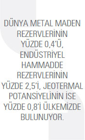 Ülkemizin maden rezervleri incelendiğinde, toplam üretimde dünyada 28’inci, üretilen maden çeşitliliğinde ise 10’uncu sırada olduğu görülüyor. Dünya metal maden rezervlerinin yüzde 0,4’ü, endüstriyel hammadde rezervlerinin yüzde 2,5’i, jeotermal potansiyelinin ise yüzde 0,8’i ülkemizde bulunuyor. Uzmanlar, madencilik sektöründe ihtiyaç duyulan teknolojileri yerli imkanlarla üretememenin yansıması olarak, madenlerimizi yeterince değerlendiremediğimiz görüşünde birleşiyor.