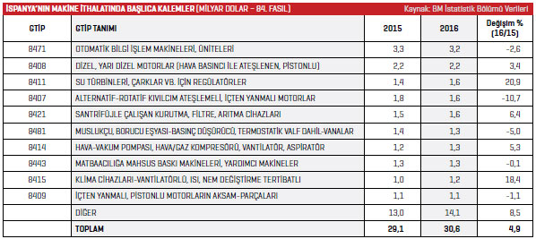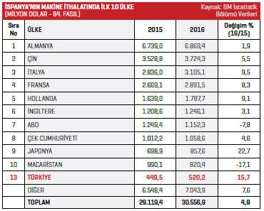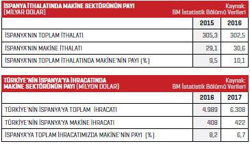 İspanya, 2016’da 302,5 milyar dolar tutarında mal ve hizmet ithal ederken, bunun 30,5 milyar dolarlık bölümü makine ve aksamlarına aitti. İspanya’nın 2016 yılı makine ithalatında Almanya, Çin ve İtalya ilk üç sırayı paylaşırken, Türkiye, İspanya’nın makine ithalatı gerçekleştirdiği ülkeler içerisinde 520,2 milyon dolarlık makine ihracatıyla 13’üncü sırada yer alıyor.