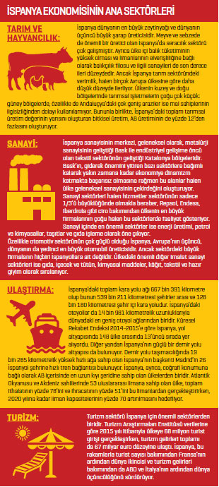 İspanya’da altı yıllık durgunluğun ardından, 2014’ün ikinci yarısında başlayan toparlanma 2015 yılında da devam etti ve yüzde 3’ü geçen bir büyüme oranına ulaşıldı. İç talep ve deflasyon, iyileştirilmiş kredi koşulları, düşük petrol fiyatları, Avrupa’daki toparlanma, euronun değerlenmesi, yeni reformların devreye sokulması yabancı yatırımcının güvenini kazandırarak büyümeye destek olurken, iç talepteki yükseliş, 2016 ve 2017 yıllarında da ekonomik büyümede tetikleyici unsurlar olarak öne çıktı.