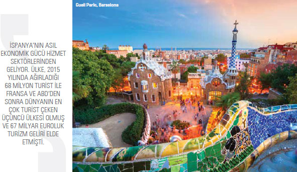 İspanya’nın asıl ekonomik gücü ise hizmet sektörlerinde kaynaklanıyor. Ülke, 2015 yılında ağırladığı 68 milyon turist ile Fransa ve ABD’den sonra dünyanın en çok turist çeken üçüncü ülkesi olmuş ve 67 milyar euroluk turizm geliri elde etmişti.