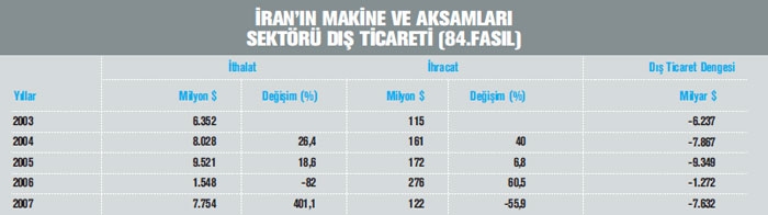 2003-2007 yılları arasında İran’ın makine ve aksamları dış ticaret verileri analiz edildiğinde dış ticaret açığının 2006 yılı- na kadar artış eğiliminde olduğu dikkat çekiyor. 2006 yılında ise bu açığın gerileyerek 1,2 milyar dolar düzeyinde gerçekleştiğ i görülüyor. 2006 yılı dışında ithalatı n her yıl bir önceki yıla göre arttı- ğı gözlenirken, ithalatta en büyük artış oranı 2004 yılında, ihracatta en büyük artış oranı ise 2006 yılında kaydedilmiş. 2007 yılında ise bu açık 7,6 milyar dolar düzeyinde kaydedilmiş. Dörtlü GTİP bazında sıralandığında 2007 yılında İran’ın başlıca makine ithal kalemleri arasında 455 milyon dolar ile GTİP: 8411’de yer alan “Türbin, Turbojet ve Aksamları,” ilk sırada yer alıyor. 8414 GTİP numaralı “Hava-Vakum Pompası, Hava/Gaz Kompresörü, Vantilatör, Aspiratör” ikinci sırada bulunuyor. İran’ın en fazla makine ithal ettiği ilk beş ülke olan Almanya, İtalya, Çin, Güney Kore ve Fransa ülkenin makine ithalatının yüzde 53’ünü teşkil ediyor. Türkiye ise ülkenin makine ithalatında 15. sırada yer alıyor. Dörtlü GTİP bazında sıralandığında 2007 yılında İran’ın başlıca makine ihraç kalemleri arasında 15,7 milyon dolar ile GTİP 8474’de yer alan “Toprak, Taş, Metal Cevheri vb. Ayıklama, Eleme vb. için Makineler ” ilk sırada yer alıyor. İran’ın en fazla makine ihraç ettiği ilk beş ülke olan Almanya, Güney Afrika, Fransa, Kazakistan ve Hollanda ülkenin makine ihracatının yüzde 45’ini teşkil ediyor. Türkiye ise ülkenin makine ihracatı nda 42. sırada yer alıyor.