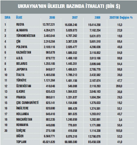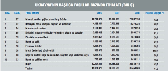 BM verilerine göre; bir önceki yıla kıyasla Ukrayna’nın ihracatı yüzde 35,9 artarak 2008 yılında 67 milyar dolar olmuştur. Ülkenin genel ihracatında en çok payı alan ilk üç ülke sırasıyla Rusya, Türkiye ve İtalya’dır. Ukrayna’nın önemli ihraç ürünleri ise “demir ve çelik”, “mineral yakıtlar, yağlar” ve “hububat” tır. Makine ve aksamları ürün grubu Ukrayna’nı n toplam ihracatından yüzde 5,2 pay almaktadır. Ukrayna’nın ithalatı ise yüzde 41 artarak 2008 yılında 85,5 milyar dolara ulaşmıştı r. Ülkenin genel ithalatında en çok payı alan ilk üç ülke sırasıyla Rusya, Almanya ve Türkmenistan olmuştur. Önemli ithal kalemleri ise “mineral yakıtlar, yağlar”, “demiryolu harici karayolu taşıtları ve aksamları”, “makine ve aksamları” dır. Ülkenin genel ithalatında makine ve aksamları nın payı yüzde 11,2 seviyesinde.
