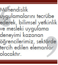 Alanlarında uzman, yetkin ve dinamik bir akademik kadroya sahip olan bölümümüzü tercih edecek öğrenciler, teorik ve uygulamalı eğitim-öğretim faaliyetlerinin yanında, sanayi ile el ele bilimsel çalışmalar yürüten bölüm elemanlarımızın yaptığı çalışmalarda da fiilen yer alabilecek. Gerçek mühendislik uygulamalarını tecrübe ederek, bilimsel yetkinlik ve mesleki uygulama deneyimi kazanan öğrencilerimiz sektörde tercih edilen elemanlar olacaktır.