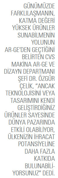 Ar-Ge çalışmalarına başladığımız 2010 yılında Ar-Ge harcamaları bütçenin yüzde 0.05’ine karşılık gelirken 2010’dan günümüze kadar, bu oran yıllara bağlı olarak giderek artış gösterdi. Özellikle Ar-Ge merkezinin kurulmasıyla birlikte hissedilir şekilde artarak 2013 yılında yüzde 2,5’i, 2014 yılında ise yüzde 3,5’i aştı. Standart ürün sunmadığımız ve her projede ürünlerimiz, tasarımı ve mühendisliğiyle birlikte baştan yapıldığı için bu sürece mutlaka Ar-Ge dahil oluyor. Bu nedenle CVS Makina’nın Ar-Ge’den vazgeçmesi mümkün değil. Yönetim kurulumuzun da Ar-Ge çalışmalarına verdiği destekle yıllara bağlı gelişen Ar-Ge istikrarımızın devam edeceğini düşünüyorum.
