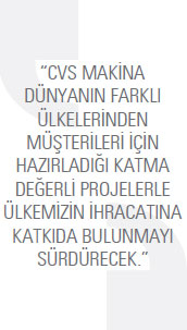 CVS Makina 15 senelik bir geçmişi olmasına karşın mühendislikten tasarıma, üretimden kuruluma kadar bütün süreçleri kendisinin yürütmesiyle kısa zamanda dünyada anahtar teslim demir-çelik fabrikaları kuran ve ekipmanlarını üreten birkaç büyük firmadan birisi haline geldi. CVS Makina dünyanın farklı ülkelerinden müşterileri için hazırladığı projelerle kendi gelişimine ve ülkemizin ihracatına katkıda bulunmaya devam ediyor. Firmamız, 2013 yılında bir önceki seneye istinaden kategorisinde en yüksek ihracatı yapan firmaya sunulan ihracatın yıldızı ödülünü makine alanında almaya hak kazandı.