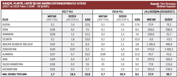2018 yılının 1 Ocak-28 Şubat döneminde Türkiye geneli kauçuk, plastik, lastik işleme makineleri sektöründe ihracat artışının en fazla yaşandığı ülke yüzde 1.406,1 ile Özbekistan oldu. Listenin ikinci sırasında yüzde 495,9 Avrupa Serbest Bölgesi yer alırken söz konusu ülkeyi yüzde 206 ihracat artışıyla İran üçüncü sırada izledi.