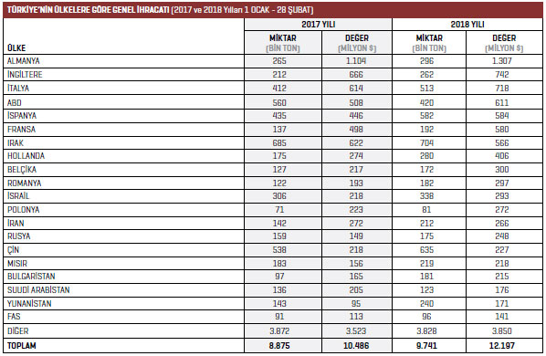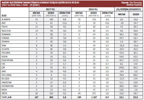 Kauçuk, plastik, lastik işleme makineleri mal grubunda 2018 yılının 1 Ocak-28 Şubat döneminde en fazla ihracat 2,5 milyon dolarla Rusya’ya gerçekleştirildi. 2017 yılının aynı döneminde bu rakam 1,4 milyon dolardı. Rusya’ya yönelik ihracat yüzde 76,1 arttı. Listenin ikinci sırasında yer alan İran’a 2017 yılının 1 Ocak-28 Şubat döneminde 519 bin dolar değerinde ürün ihraç edilirken 2018 yılının aynı döneminde bu rakam yüzde 206 artışla 1,5 milyon dolar oldu. Listenin üçüncü sırasındaki Romanya’ya 2017 yılının 1 Ocak-28 Şubat döneminde 1,2 milyon dolar değerinde ihracat gerçekleştirilirken 2018 yılının aynı döneminde bu rakam yüzde 25,7 artışla 1,5 milyon dolar oldu. Dördüncü sırada bulunan Cezayir’e 2018 yılının 1 Ocak- 28 Şubat döneminde 1,3 milyon dolarlık ihracat gerçekleştirildi. Beşinci sıradaki Avrupa Serbest Bölgesi’ne 2017 yılının 1 Ocak-28 Şubat döneminde 190 bin dolar değerinde ürün ihraç edilirken 2018 yılının aynı döneminde bu rakam yüzde 495,5 artışla 1,1 milyon dolar oldu.