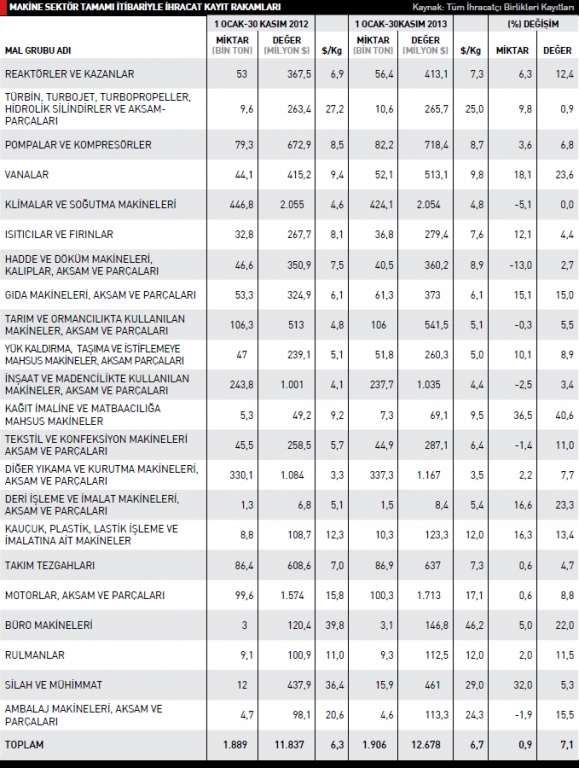 Makine ihracatı 2013 yılı Ocak-Kasım döneminde, bir önceki yılın aynıd önemine göre yüzde 7,1 artış kaydederek...