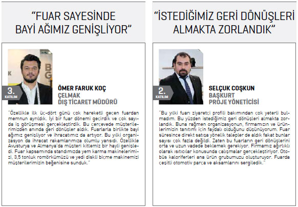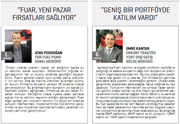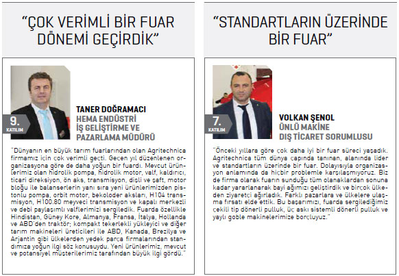 Türk ve yabancı davetlilerden oluşan ve yaklaşık 200 kişinin katıldığı kokteylde Zeynep Erkunt Armağan sektör adına temaslarda bulundu. Fuar çerçevesinde çeşitli temaslarda bulunan TARMAKBİR Genel Sekreteri Selami İleri, Agritechnica’nın klasik bir fuardan öte gerçek bir şova dönüştüğünü aktararak şunları söyledi: “‘Yeşil Gelecek ve Akıllı Teknolojiler’ sloganıyla kapılarını açan Agritechnica’da bu yıl yabancı katılımcıların oranı yüzde 60 ile en yüksek değere ulaştı. Özellikle Hint-Asya bölgesinden üreticilerin ilk kez fuara katılması, Agritechnica’nın dünyanın önde gelen tarımsal makine ve ticaret fuarı olarak öne çıktığını açıkça gösteriyor. Türkiye, yaklaşık 108 katılımcı firma ve yaklaşık 6 bin metrekarelik stant alanıyla bu yıl fuara artı bir değer kattı. 2017 yılının resmi istatistikleri henüz açıklanmadı fakat katılımcı ülke sıralamasında yine ilk beşte yer almamız muhtemel gözüküyor. Fuara katılan traktör ve ekipman firmalarının neredeyse tamamının üyemiz olması da bizler için bir övünç kaynağıydı. Fakat bu sayının daha da artması gerekiyor. Katılımcı sayısında çok iyi olsak da hem metrajlarımız küçük hem de komponent ve yedek parça sektöründe faaliyet gösteren firmaların yüzdesi çok daha fazla. İşin prestij kısmı bir yana, fuara katılan üyelerimiz bu yıl çok daha memnun ayrıldı. Özellikle Kuzey Amerika, Doğu Avrupa, Asya ve Afrika’dan gelen ziyaretçi sayısında da kayda değer artış yaşandı. Bu da zaten fuar kapsamında yapılan yeni sözleşmelere, yeni siparişlere yansıyor.” 21 ülkenin milli katılım organizasyonuyla katıldığı fuar çerçevesinde Türkiye’nin Makinecileri çeşitli görüşmeler gerçekleştirerek, Türk tarım makineleri sektörünün tanıtımı için etkin bir faaliyet yürüttü.