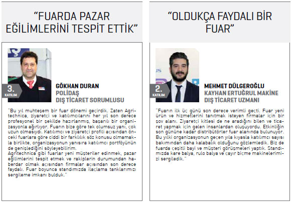 MAİB Yönetim Kurulu Başkanı Adnan Dalgakıran fuarla ilgili yaptığı değerlendirmede, tarımsal üretimin gelişmiş ekonomilerdeki yerinin gittikçe derinleştiğini vurgulayarak şunları söyledi: “Pek çok ülke kaynakların ve çevrenin korunmasını gözeten sürdürülebilir tarım dönemini yakalayamaya çalışırken üretimin niceliğinden ziyade niteliğine odaklanan Tarım 3.0 dönemi geldi. Tarım 3.0’da üreticiler teknolojik altyapı ve tarımsal bilgi birikimiyle üretim yapacak. Unutmayalım ki, modern tarımsal faaliyetler artık ileri ekonomiler için de gelişmişlik göstergesi. Dünyada son 10 yılda hiçbir malın fiyatı tarım ürünleri kadar değer kazanmadı. Tarımın ihracat değerlerine de doğrudan yansıyan bu gelişimini kendi lehimize kullanmak için teknolojik yatırımları, üreticinin eğitimini ve kamu desteğinin niteliğini yeniden konuşmalıyız.” Türkiye’de tarımın son yıllardaki teşviklerle önemli bir atılım yaşadığının altını çizen Dalgakıran sözlerini şöyle noktaladı: “Türkiye’de 2018 yılında tarıma yaklaşık 15 milyar liralık destek verilmesi öngörülüyor. Diğer yandan, tarım makinelerinin teknolojik açıdan iyileştirilmesi, teşvikler kadar büyük önem taşıyor. Yerli üreticinin tarım makinelerinin rekabetçi özelliklere kavuşturulması için çalışmalıyız. Tarım 3.0 kavramının ülkemizde yerleşik hale gelmesi için eğitim ve teknolojiye öncelik vermeliyiz. Dünyanın öncü tarım ülkelerine baktığımızda uzun vadeli stratejiler ve politikalarla bu noktaya geldiklerini görüyoruz. Bizim de stratejik planlamalarla aynı başarıyı yakalayacağımıza inancımız tam.”