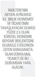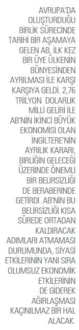 Avrupa Birliği ekonomisi küresel kriz sonrası uzun süren resesyonun ardından son iki yıldır kademeli, ancak kırılgan bir ekonomik toparlanma içine girmişti. AB ve Euro Bölgesi ekonomileri yüzde 1,5-2,0 arasında bir büyüme temposuna yaklaşmaktaydı. İngiltere’nin ayrılık kararı ile birlikte Birliğin siyasi geleceğine ilişkin ortaya çıkan belirsizlik ekonomik toparlanma ve büyümeyi de olumsuz etkileyecektir. Yılın ikinci yarısında ve 2017 yılında AB ve Euro Bölgesi’nde daha yavaş bir ekonomik büyüme gerçekleşecektir. İspanya, İtalya, Portekiz ve Yunanistan gibi ülkelerin ekonomik sorunları yeniden artabilecektir. Avrupa Parasal Birliği ve Euro da tartışma konusu olacaktır ve muhtemelen Euro önümüzdeki iki yıl içinde zayıf kalacaktır.