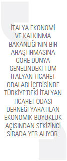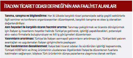 Odamız, İtalya pazarına açılmak isteyen Türk firmalara doğrudan bilgi aktarımı ve taleplerine uygun danışmanlık hizmetleri veriyor. Bu çerçevede yılda yaklaşık 1.000 adet yazılı talep yanıtlıyor, İtalya pazarına girme aşamasında olan Türk firmalarla yine yüzlerce toplantı gerçekleştiriyoruz. Halen 600’den fazla üyemiz bulunuyor ama kapımız herkese açık. Oda olarak gerek İtalya’da gerekse Türkiye’de yatırım yapmak, yeni iş kurmak, temsilcilik almak gibi ticari faaliyette bulunmak isteyen tüm girişimciler bizden danışmanlık alabilir. Bugün 600’ü aşan üye sayımızla ve verdiğimiz hizmetlerle iki ülke arasındaki ticarete ciddi bir katkı sağladığımıza inanıyorum ki son 10 yılda iki ülke arasında gerçekleşen ticaretteki artış da bunun kanıtıdır. Yenilenebilir enerji ve makine sektörleri gibi henüz hak ettiği noktada olmayan bazı potansiyel sektörlerin de devreye girmesiyle ticaret hacmimiz daha da artacaktır.